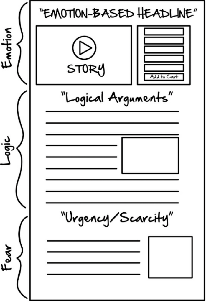 emotional (story and useful thing) -> logical (list what you can learn) -> fear (limited offer ) -> CTA (button or form)